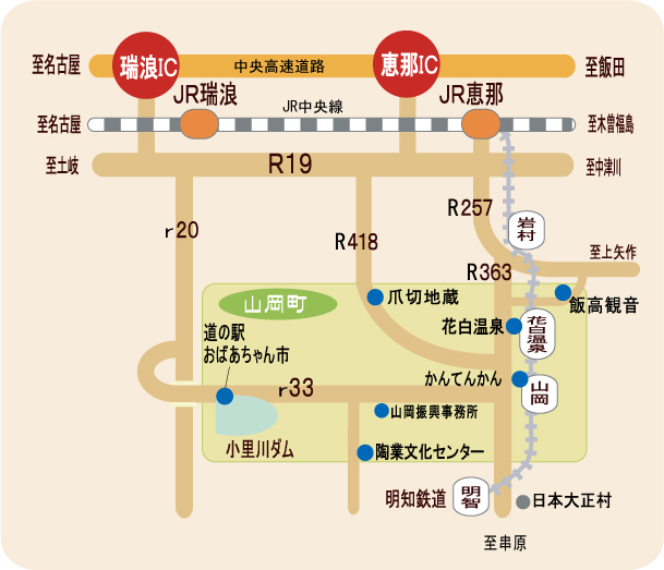 恵那市街からは、お車で国道257号と363号で約25分。 明知鉄道で約40分で来られます。